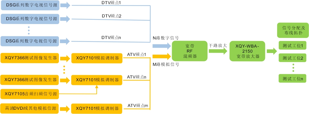集中信號源系列包含數(shù)字電視信號源設(shè)備及一系列模擬電視信號源設(shè)備,所有頻點(diǎn)信號混頻通過寬帶放大器進(jìn)行信號放大器進(jìn)行信號放大后通過布線拓?fù)渚W(wǎng)絡(luò)分配到各個測試工位